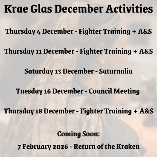 Our Thursday Night Gathering & Training will run as usual every week – except Christmas day (& New Year’s Day)! Come along to the Dolphin’s Keep from 7pm on the 4th, 11th & 18th for both rapier & heavy fighting, as well casual arts & sciences or even just to socialise. As always, everyone is welcome to attend, with no bookings or garb needed.